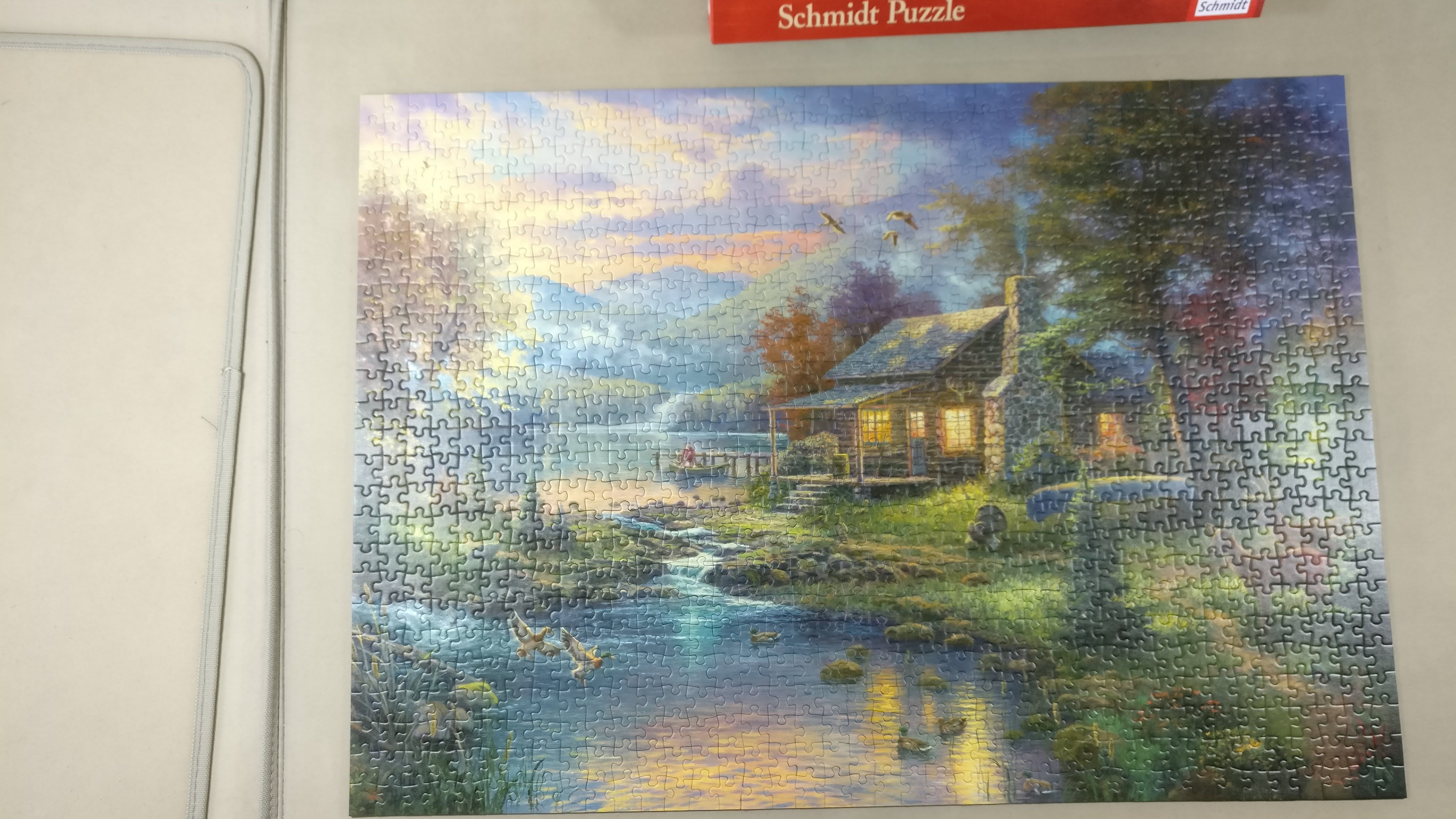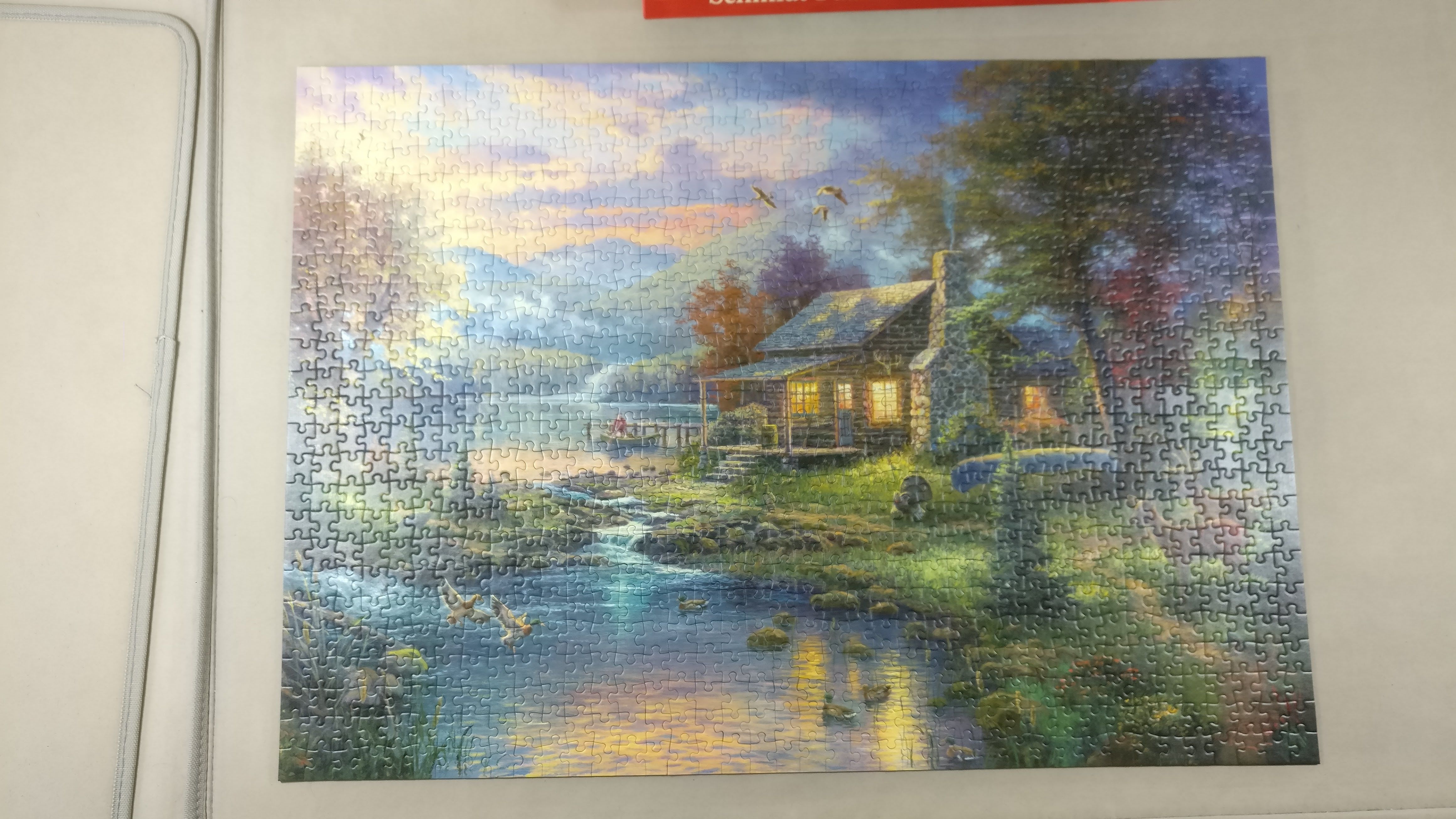 Das Motiv lässt es prima zu, die Teile vorzusortieren: Haus, Wasser, Bäume, Himmel. Damit sind knapp 80% des Puzzles vorsortiert. Das legen dauert dann etwas länger, weil viele ähnliche Strukturen im “Garten” geneures Studium der Puzzleteile notwendig machen, wie so oft bei gemalten motiven. Lichereflexionen im Wasser und ähnliche Lichteffekte in den Wolken ebenso.